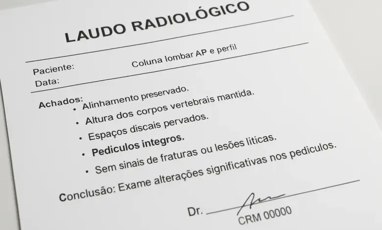 Em laudos, expressões como “alinhamento preservado”, “sem sinais de fratura” e “canal vertebral livre” costumam acompanhar a descrição de pedículos íntegros.